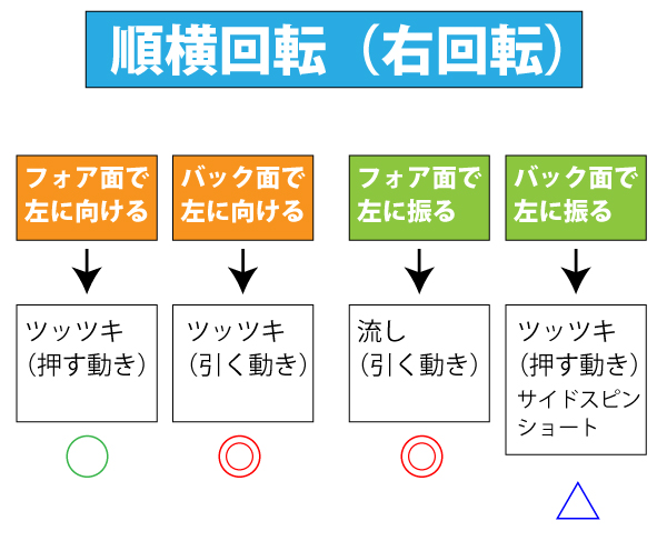 横回転に対する二つの考え方 横回転は、その名の通り横方向に回転がかかっていて、真っすぐ当てたら横に飛んでいきます。 まずは右利きの順横回転(右回転)を軸に考えましょう。 右回転は真っすぐ当てると右に飛んでいきます。 右に飛ぶボールに対しては... -